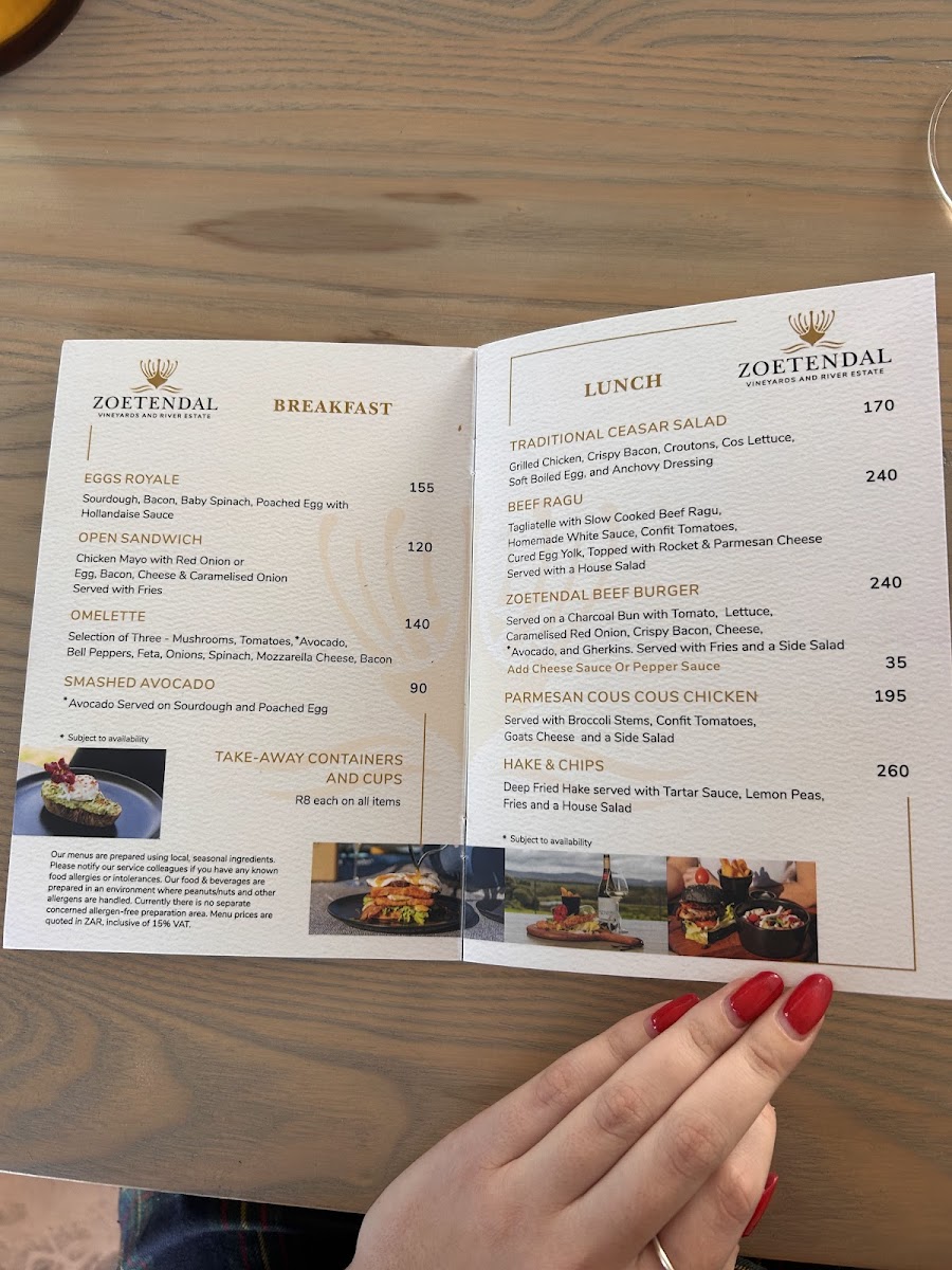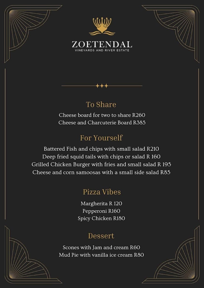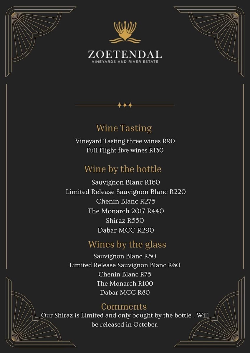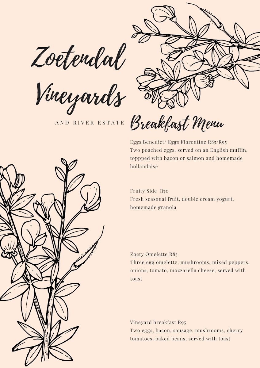 Welcome to Zoetendal Vineyards & River Estate, a hidden gem nestled in the picturesque Moddervlei Farm, South Africa. This enchanting destination is perfect for wine lovers and nature enthusiasts alike, offering stunning views and a relaxed atmosphere. At Zoetendal, you'll find a curated menu that includes delightful breakfast and lunch options, perfectly complemented by their exquisite wine tastings. Customers rave about the attentive service, highlighting the warm hospitality from the staff, which makes every visit comfortable and memorable.